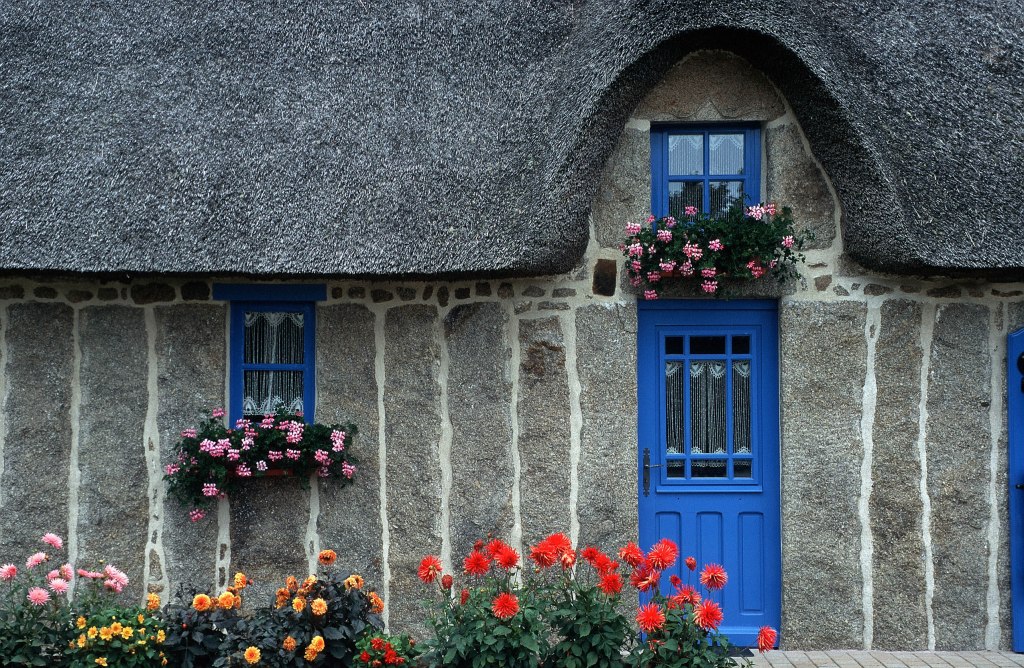 Den Urlaubsort für unseren ersten Bretagneaufenthalt haben wir damals vollkommen auf gut Glück gewählt, haben dabei aber offenbar alles richtig gemacht. Wir haben eine Bretagne vorgefunden, wie wir sie uns kaum schöner vorstellen können, und Vieles von dem, was uns bis heute, nachdem wir inzwischen noch weitere Bereiche der Bretagne, auch ihren Norden, kennen, am besten gefällt, war ganz in der Nähe unserer hübschen Unterkunft: Concarneau mit seiner ville close und Pont Aven, vor allem aber die vielen noch viel kleineren Orte oder manchmal auch nur Ansammlungen von schmucken reetgedeckten Häusern. Auf unseren Fahrradtouren waren wir immer wieder begeistert von den meist nur kleinen Granitsteinhäusern, die kaum höher schienen als die Reihen blühender Hortensien oder Stockrosen davor.