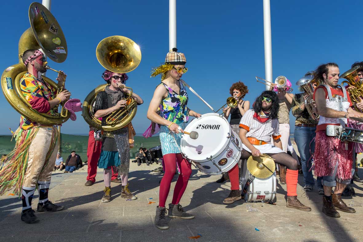 Womit ich wieder nach Dünkirchen zurückkomme. Eigentlich wollten wir uns das FRAC ansehen, eine alte Werfthalle im nicht mehr genutzten Bereich des Hafens, die zu dem Zeitpunkt gerade als Zentrum für zeitgenössische Kunst neu eröffnet worden ist. Und wir gerieten, Wochen nach unserem Aschermittwoch, in den Karneval. Was für ein Glückszufall. Es war ein riesiges fröhliches Fest, mit viel Musik und einer politisch wenig korrekten, aber witzigen Kostümierung. Im Laufe des Tages haben wir viel erfahren. Man war allgemein in bester Feierlaune und gleichzeitig auch sehr erzählfreudig. Dünkrichen ist eine Hochburg des Karnevals und man kommt aus Halbfrankreich um dabei zu sein. Es gab richtig, richtig gute Musik. Zum Dünkirchener Karneval gehört offenbar, dass Musikgruppen, Bands, Orchester anreisen, um hier aufzuspielen. Es war keine Feier der Antialkoholiker, eher nicht, aber das Thema Alkohol war nicht so beherrschend wie es hier auf den großen Rosenmontagszügen der Fall ist. Auch die Geschichte dieses Karnevals wurde uns von unseren neuen Freunden für einen Tag erklärt: er hat seinen Ursprung darin, dass die Seeleute, bevor sie für lange Monate auf dem Meer sein würden, um vor der Küste von Neufundland und Island Kabeljau zu fangen, noch einmal so richtig feiern wollten. Ich bin sicher, dass die, die da Musik gemacht und getanzt haben, nicht kurz davor standen, vor Neuseeland Kabeljau zu fangen – aber feiern konnten sie!