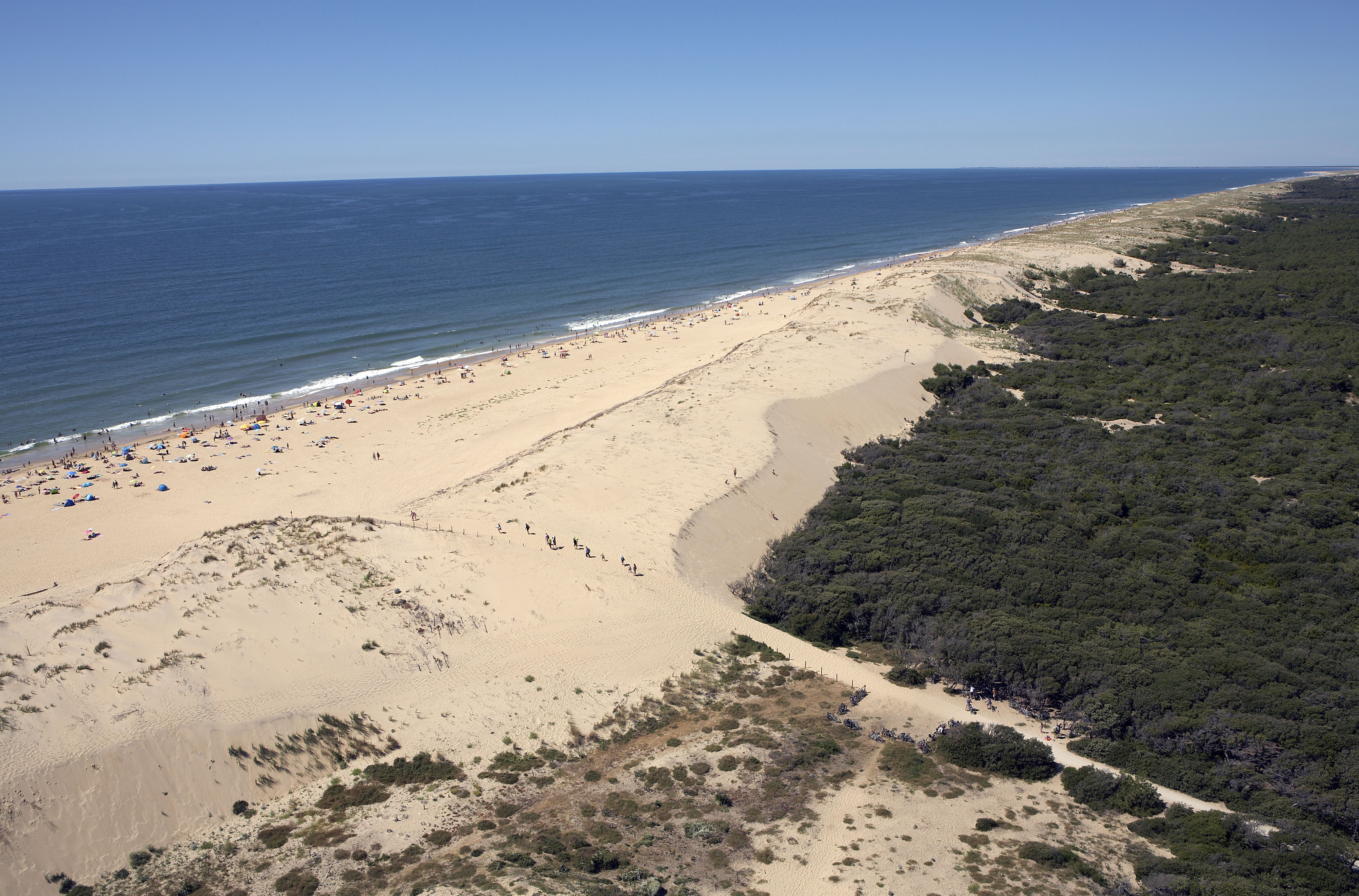Noch weiter südlich, jenseits der Garonne-Mündung, liegt das, was man verallgemeinernd als Frankreichs Südwesten bezeichnet. Nouvelle Aquitaine heißt die Region seit dem jüngsten Verwaltungsneuzuschnitt. Das hört sich dröge an, finde ich. Das Bordelais, die Gegend, aus der der berühmte Wein kommt, mit Bordeaux, der Stadt, die manche so schön finden wie Paris, und die Gascogne, die Heimat von d’Artagnan – das hört sich doch schon besser an. Es, egal wie man es nennt, der Bereich, dessen Atlantikküste man hier in Deutschland wahrscheinlich besser kennt als der nördlich davon gelegene und von mir bisher beschriebene Abschnitt. Hier kommt der Atlantik oft mit ziemlicher Kraft und hohen Wellen auf den Strand zu, das macht die Gegend bei guten Surfern beliebt, bei Familienurlaubern freut man sich darüber, dass es in zweiter Reihe hinter der Küste große Seen gibt, in denen man auch baden und auf denen man auch surfen kann, allerdings vergleichsweise ungefährlich und mit Windkraft.