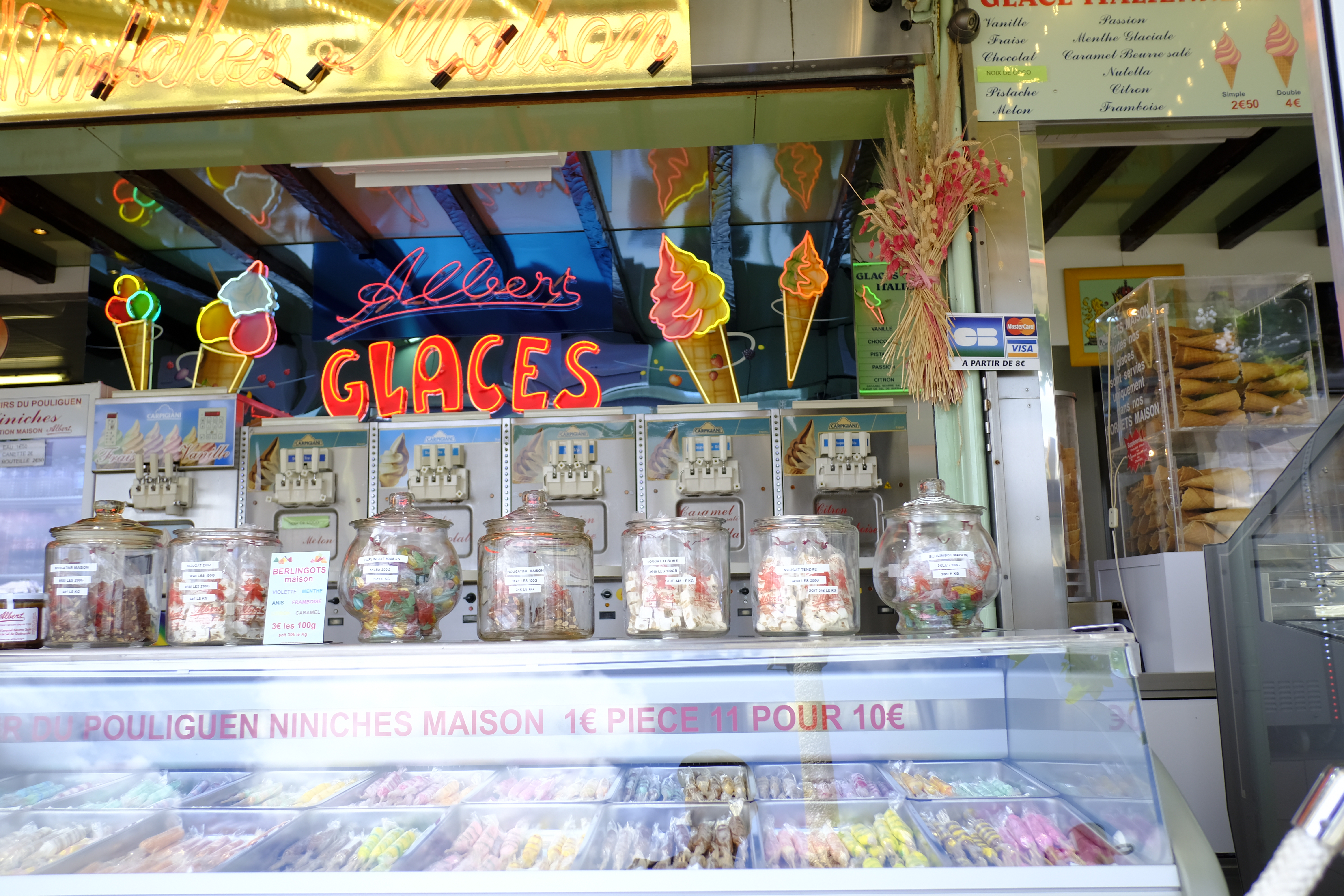 Einen schönen Strand gibt es auch, sehr viel kleiner als der von La Baule, aber dafür genau so, wie man ihn mag: mit viel Platz, mit Strandzelten, mit einem Holzweg über den Sand und mit einigen der besten Restaurants so nahe dran, dass Eltern von der Terrasse aus die Kinder am Strand beobachten können und alle anderen entspannt auf’s Meer schauen kann. Der Strand gehört zum Ort, ebenso wie der Hafen oder eigentlich eher die Hafeneinfahrt. Hier sind viele Geschäfte, Restaurants, Bars, Cafés und den ganzen Tag über Leben, bis in den Abend hinein. Am Zugang zur Hafenmole gibt es einige Geschäfte mit Zuckerwatte, Lakritz, aber auch ein Buchantiquariat, ein Kurzwarenladen mit Wolle und Knöpfen, deren Vorläufer schon auf alten Postkarten zu sehen sind, und manchmal merkt man, dass Großeltern, die ihren Enkeln ein Eis kaufen, sich noch gut erinnern, wie sie selbst hier als Kind eines bekamen.
