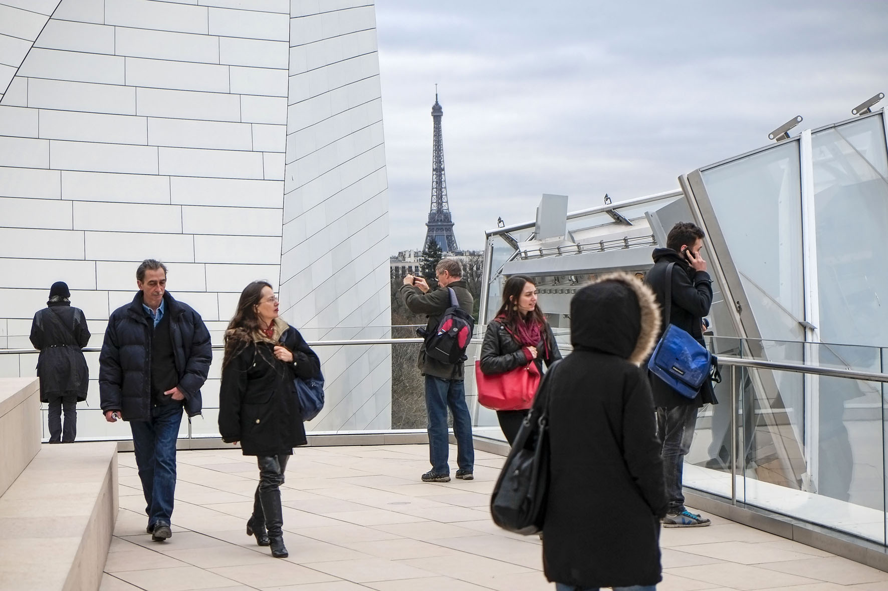 Bei unserem letzten Parisbesuch im Dezember waren wir natürlich auch neugierig, buchten die Tickets vorab im Internet und nutzten den preiswerten Busshuttle (1 Euro pro Person) von der Haltestelle in der Avenue de Friedland, nur wenige Meter vom Arc de Triomphe entfernt. Wir hatten Glück und bekamen gleich im ersten Bus zwei Plätze. Das ist nicht selbstverständlich, denn die Busse sind klein und der Andrang ist beachtlich. Auch die Schlange am Eingang der neuen Sehenswürdigkeit konnten wir dank unseres Onlinetickets links liegen lassen und sofort zuerst den Park und dann das spektakuläre Architekturobjekt entern. Kaum im Gebäude angekommen zog es uns – wie die meisten anderen Besucher – schnell wieder über eine der vielen Treppen nach draußen. Auf verschiedenen Ebenen bieten zahlreiche Plattformen interessante Perspektiven in die Außenhülle des Gebäudes – und natürlich auf Paris!