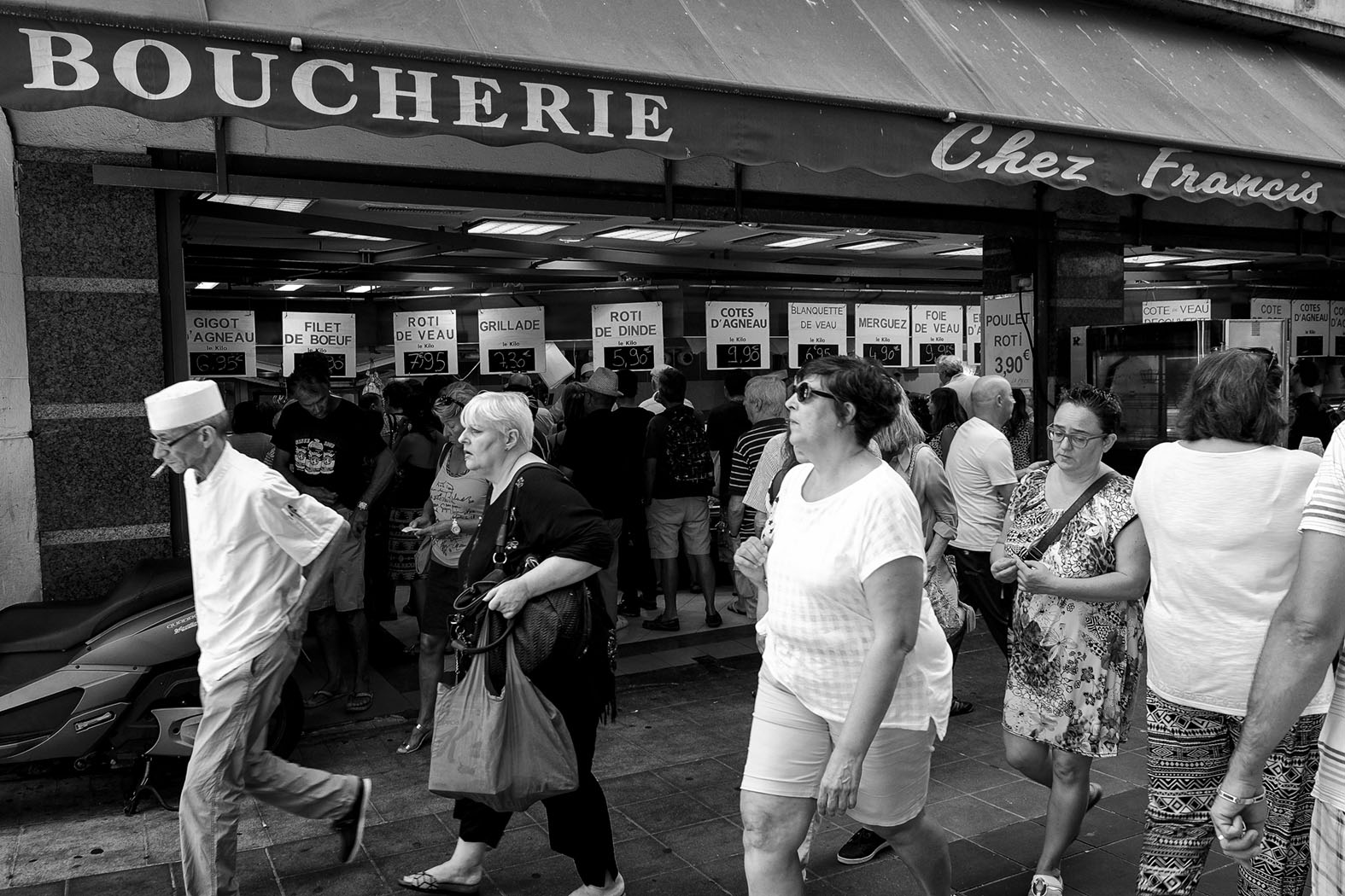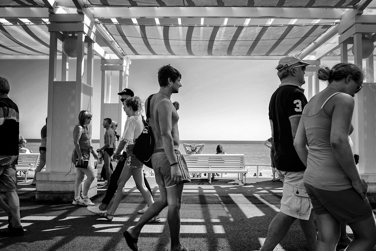 Nizza im August. Die Sonne scheint mit aller Macht und bringt die Farben zum Leuchten. Blauer Himmel, türkisfarbenes Meer, bunte Markisen, Hausfassaden in allen denkbaren Ockertönen. Eine Farborgie. Dazu ist es heiß, voll und laut. Reizüberflutung? Vielleicht gefallen mir deshalb von allen Fotos, die ich mitgebracht habe, einige Schwarz-Weiß-Aufnahmen am besten.