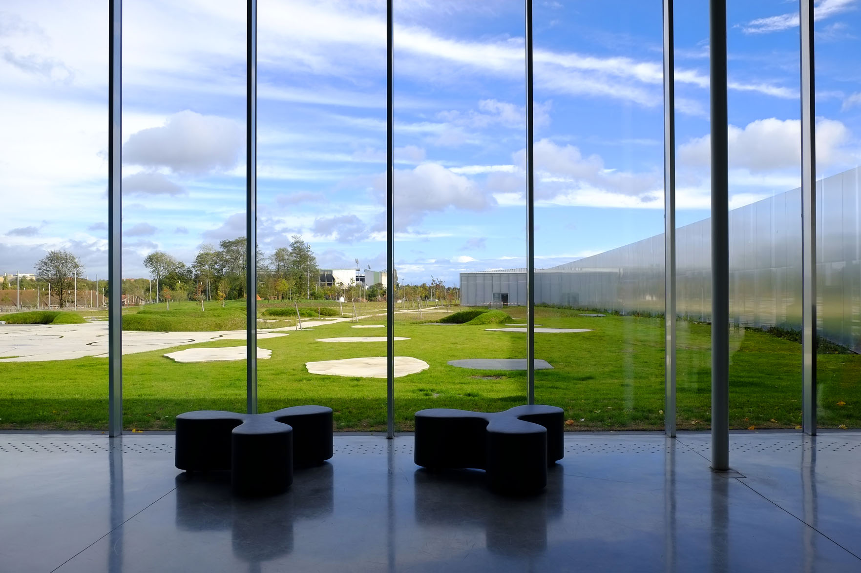 Die riesige rundum verglaste Eingangshalle besticht durch ihre Helligkeit und die Aussicht in den umgebenden  20 Hektar großen Park. Das Gebäude für die Dauerausstellung dagegen ist völlig fensterlos, bekommt aber durch Oberlichter viel Licht und vermittelt durch Wände, die mit einer matten, leicht reflektierenden Aluminiumfolie beschichtet sind, ein Gefühl von  Weite.